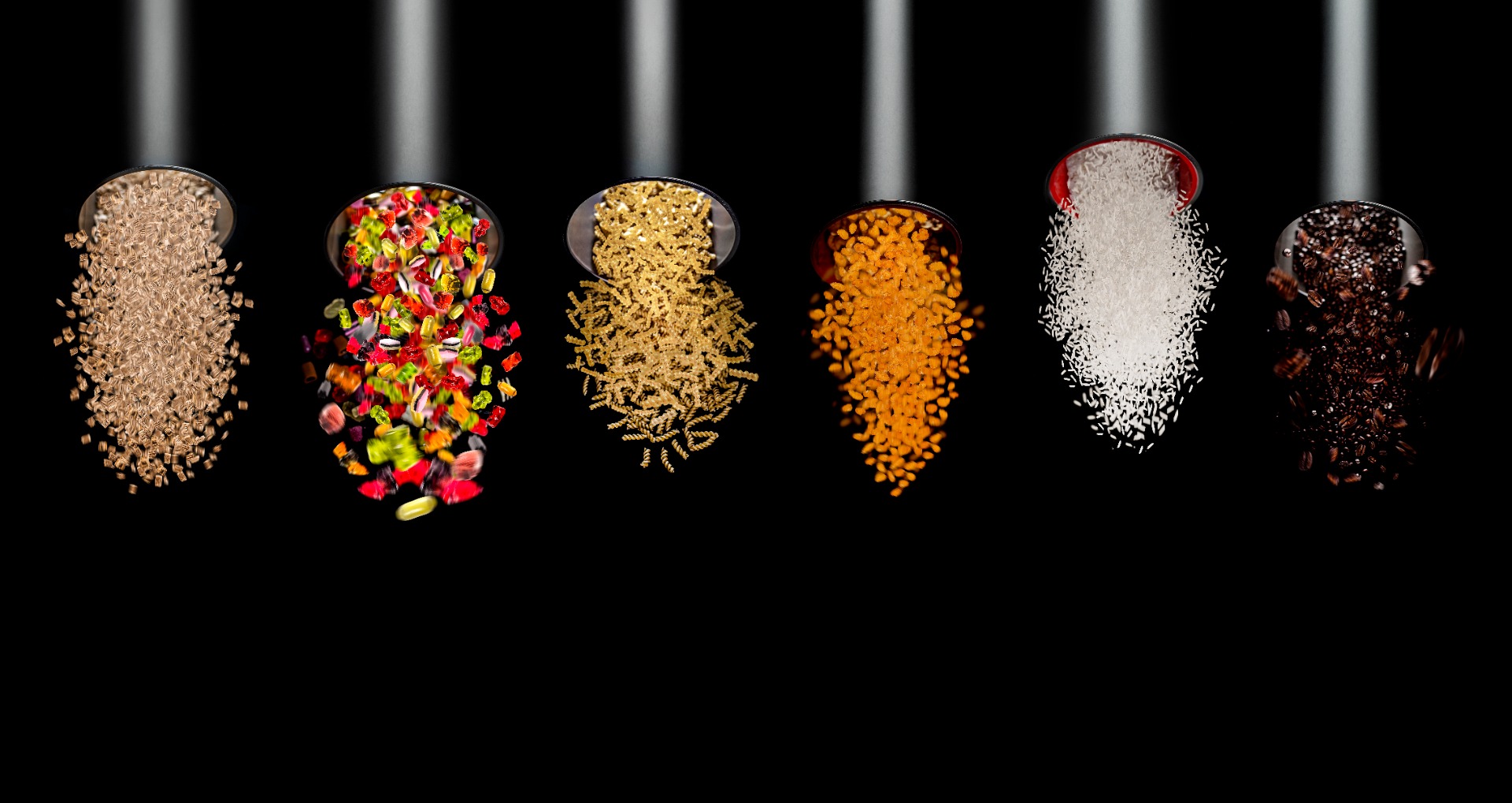 Ve spádové dopravě • Krmivo pro zvířata • Stavební materiál • Obiloviny, ořechy • Káva, kakao • Zrna • Granulát, prášek • Semena • Koření • Sladkosti a bonbóny • Tabák • Stelivo pro drobná zvířata